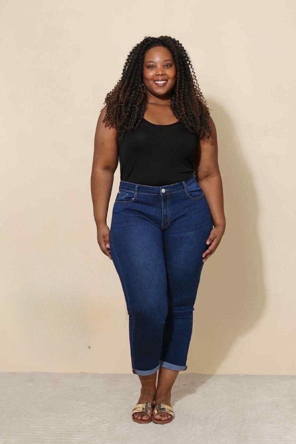 Klasyczne jeansy Plus Size to must-have w garderobie każdej kobiety ceniącej wygodę i styl. Fason został zaprojektowany tak, aby idealnie dopasować się do sylwetek z pełniejszymi biodrami i udami, zapewniając komfort przez cały dzień. Średni stan i klasyczny krój sprawiają, że jeansy te świetnie komponują się zarówno z casualowymi, jak i bardziej eleganckimi stylizacjami.