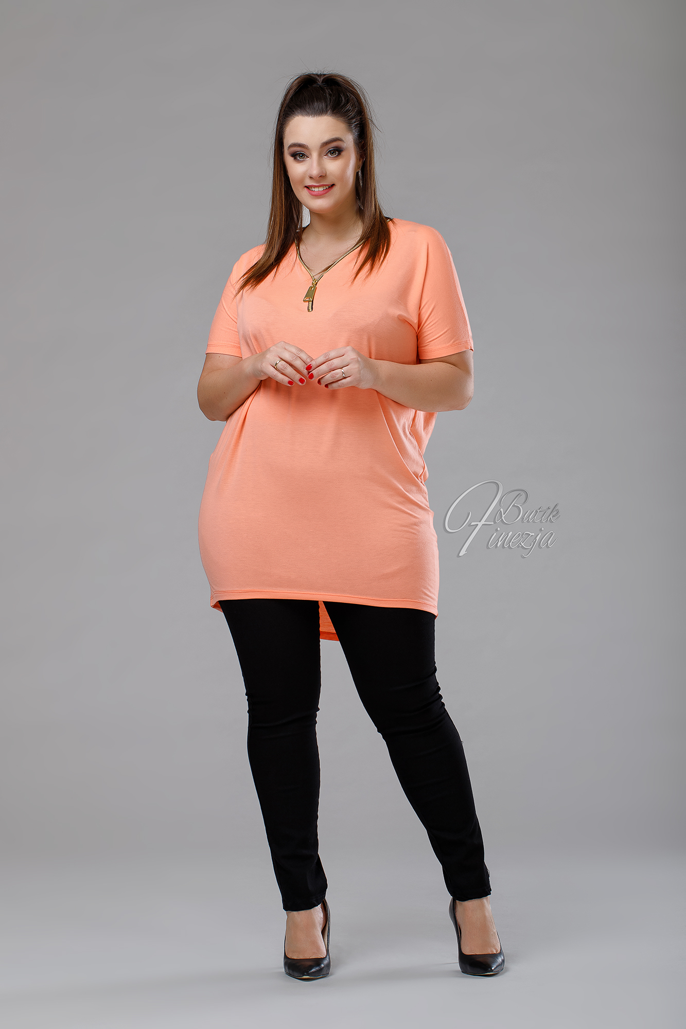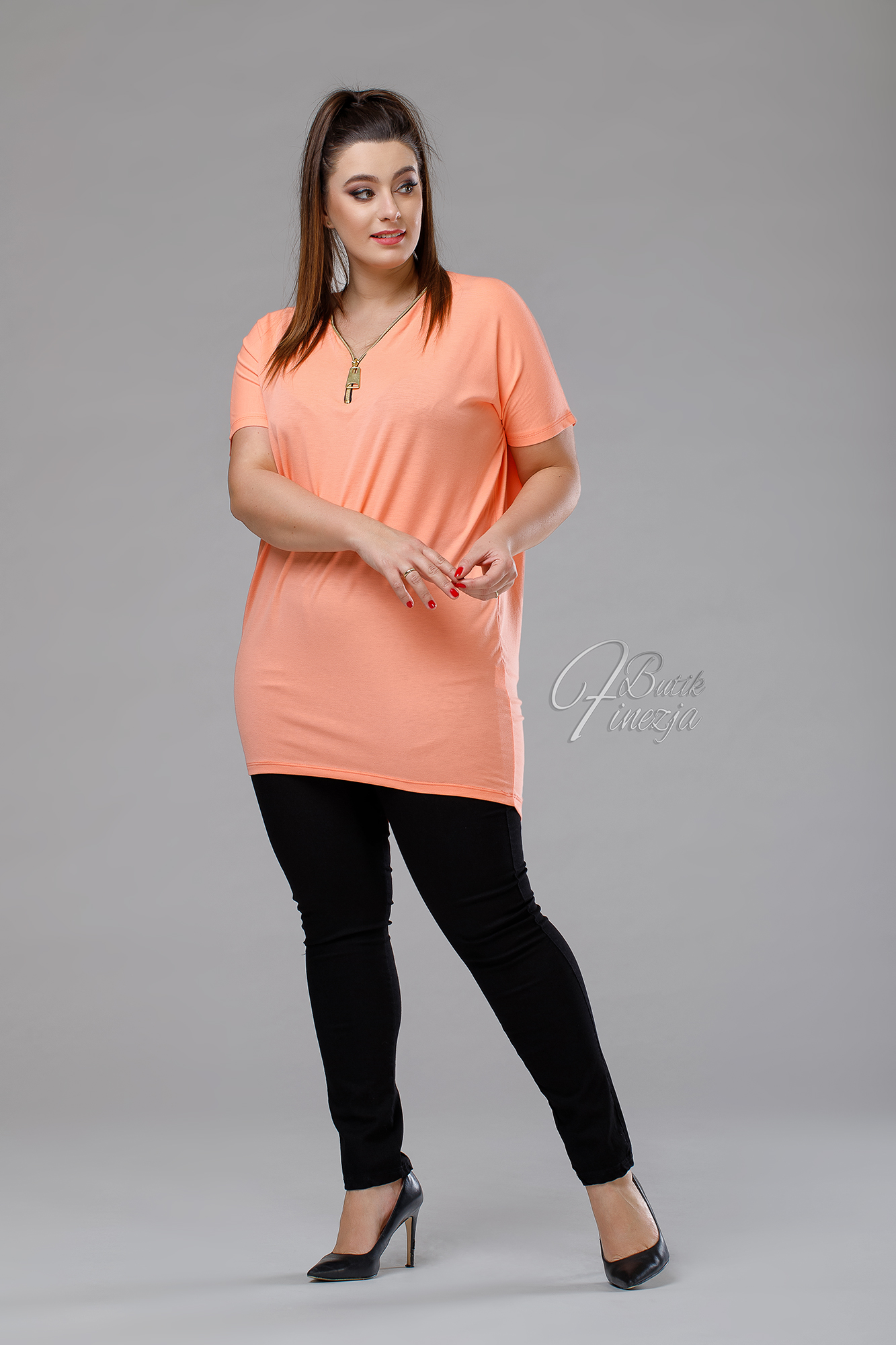 Tunika z dekoltem rozpinanym na zamek. Materiał elastyczny mięsisty średniej grubości. Krój nietoperz, tył lekko przedłużany.